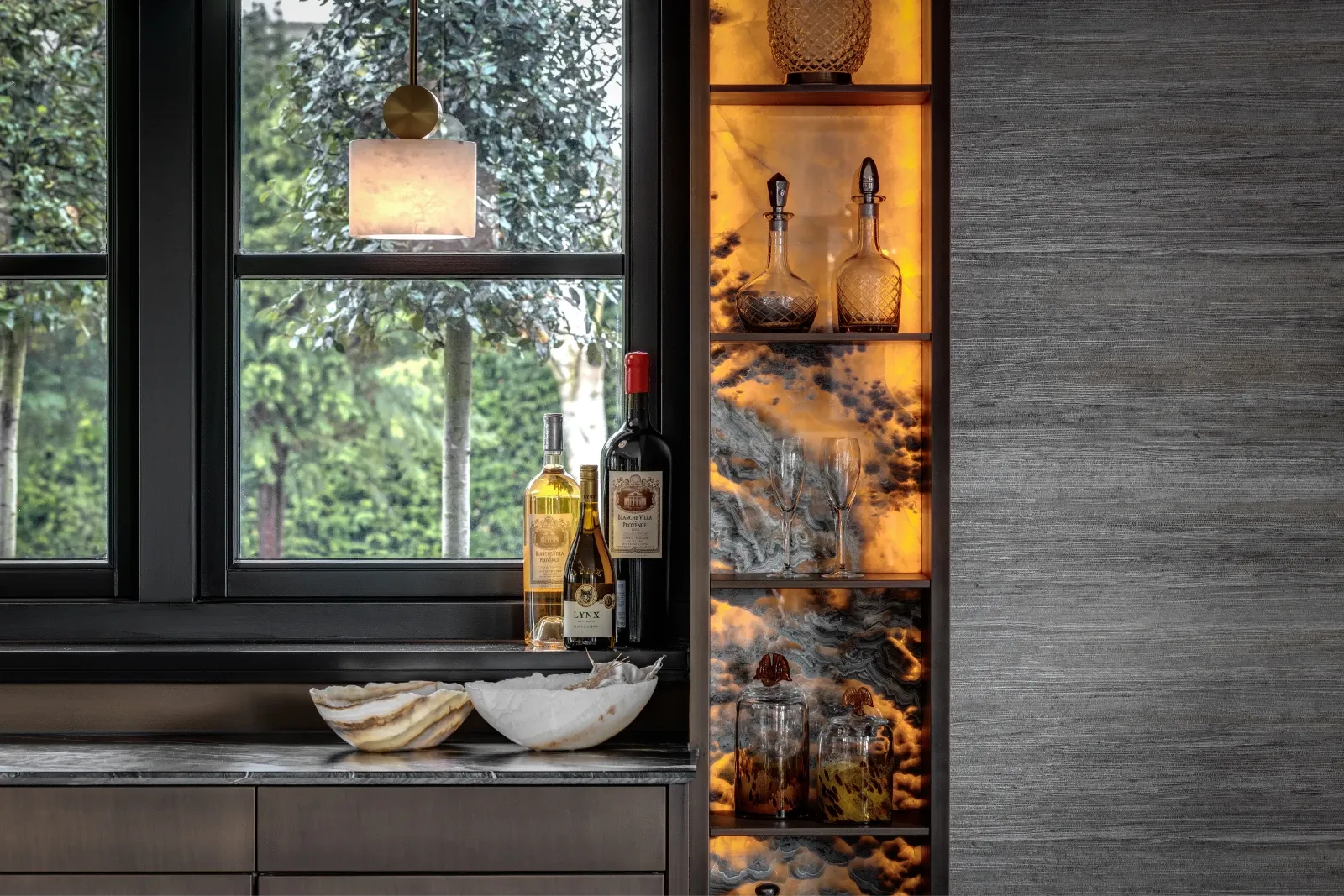 De verlichting in deze donker eiken keuken speelt een cruciale rol in het creëren van de juiste sfeer. We hebben gekozen voor verlichting van topmerken zoals Jacco Maris, Studio Italia en Brand van Egmond, die prachtig licht werpen op zowel de keuken als het Arte en Élitis-behang dat we hebben toegepast. Geniet van een moment van rust bij de Spartherm kachel, terwijl het lichtspel en de warmte de ruimte vullen. Dat is pas luxe.