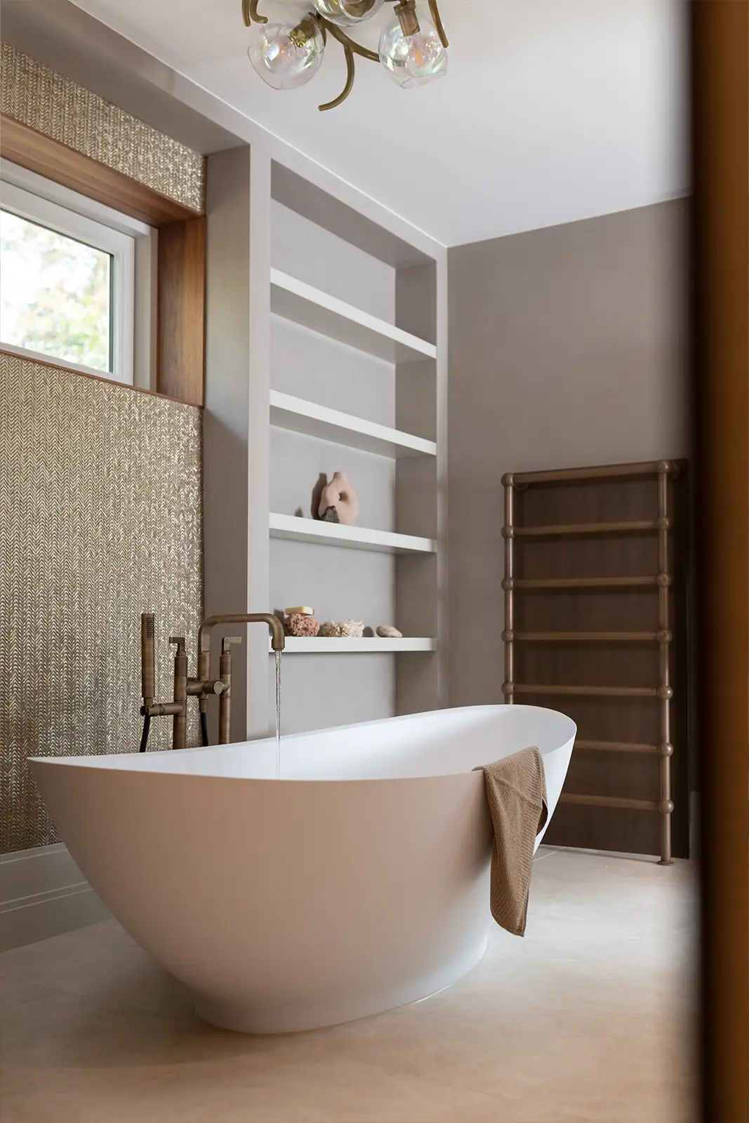 Rust en luxe komen samen in dit interieur. Een wellness kan daarom niet ontbreken in dit ontwerp.