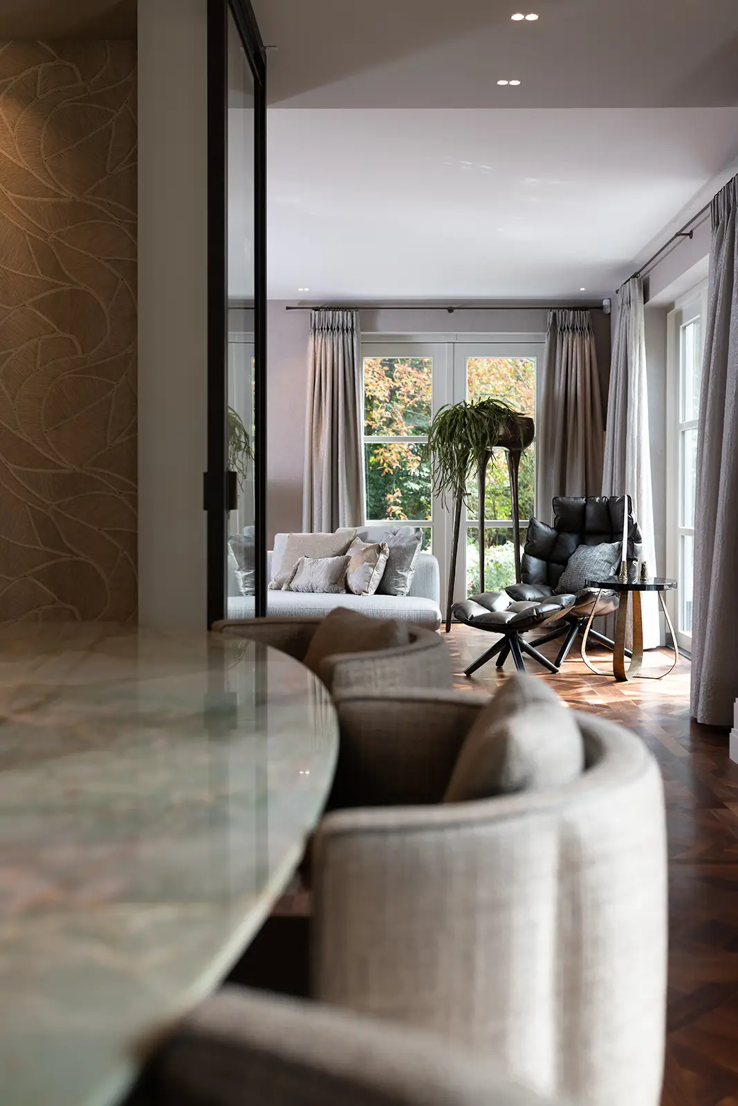 In deze woning hebben we gekozen voor topmerken zoals Minotti, B&B Italia, Riva, Georgetti, Élitis, Arte en Dutch Walltextile Company. Deze merken spelen een grote rol in het versterken van de luxe uitstraling van het interieur.