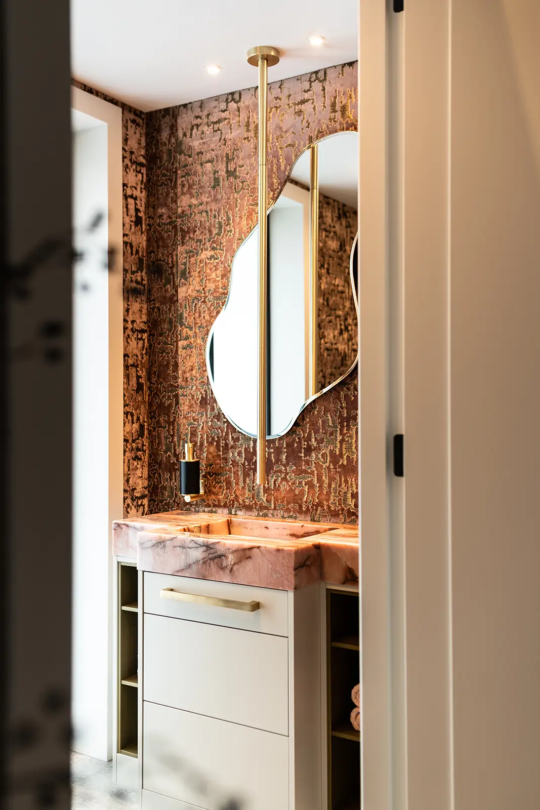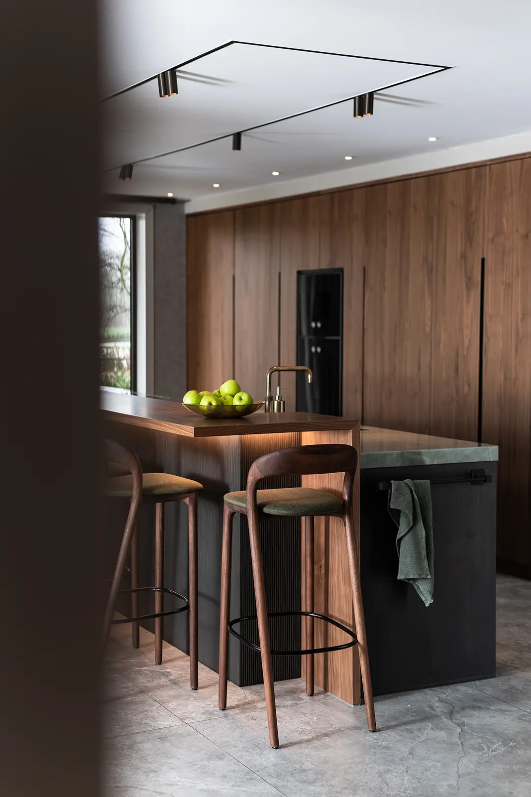 Naast het ontwerp van de keuken hebben we het volledige interieur opnieuw vormgegeven. Kleuren, materialen, verlichting en zelfs de indeling zijn volledig afgestemd op de wensen van de klant.