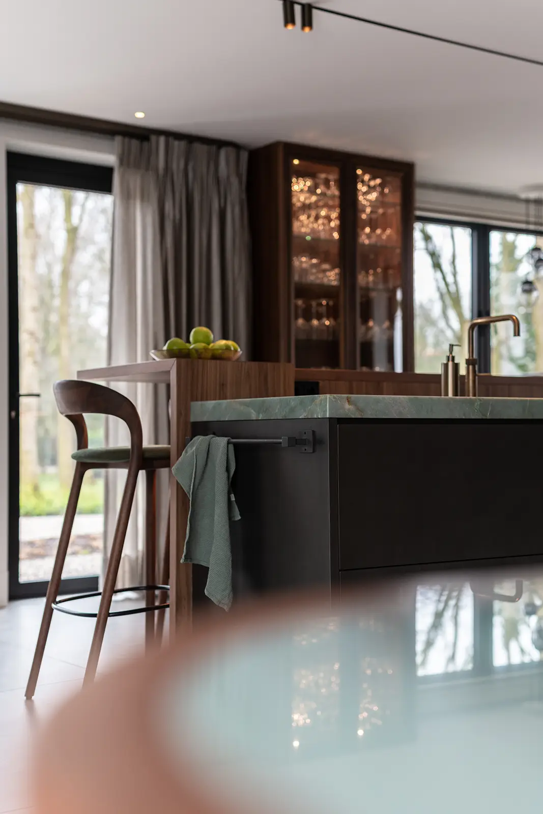 De keukenfronten zijn uitgevoerd in notenfineer, wat zorgt voor een warme basis. De mangaankleurige kasten voegen extra diepte toe en sluiten perfect aan bij het groene kwartsiet keukenblad.