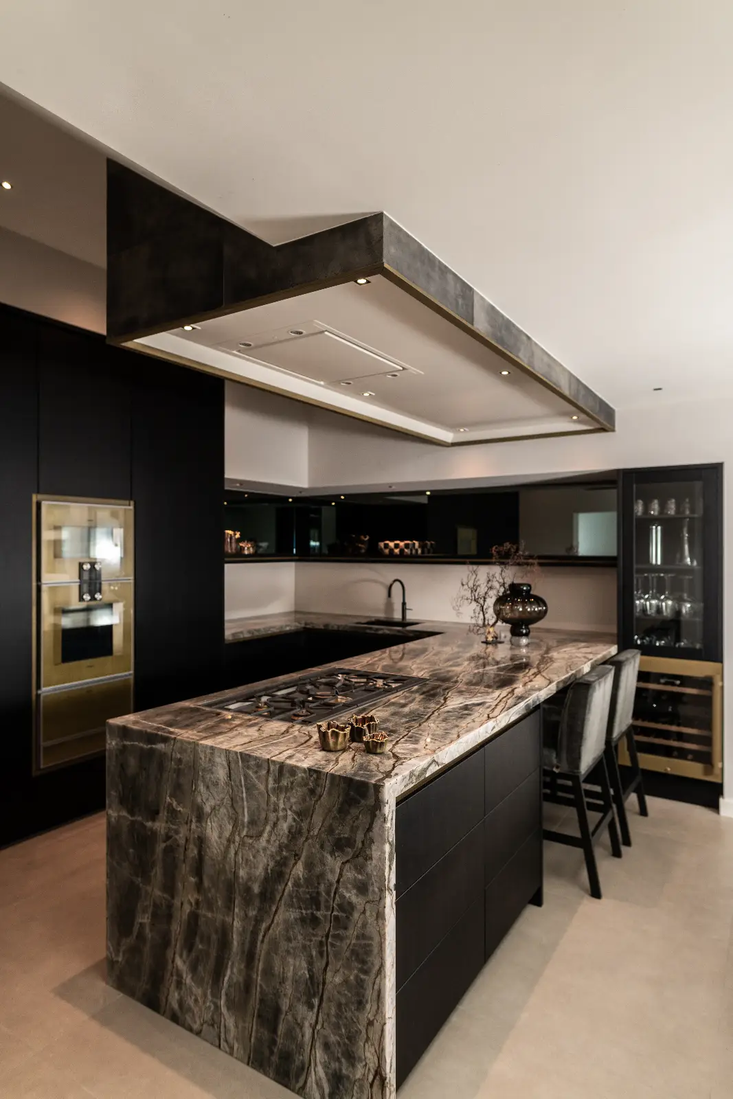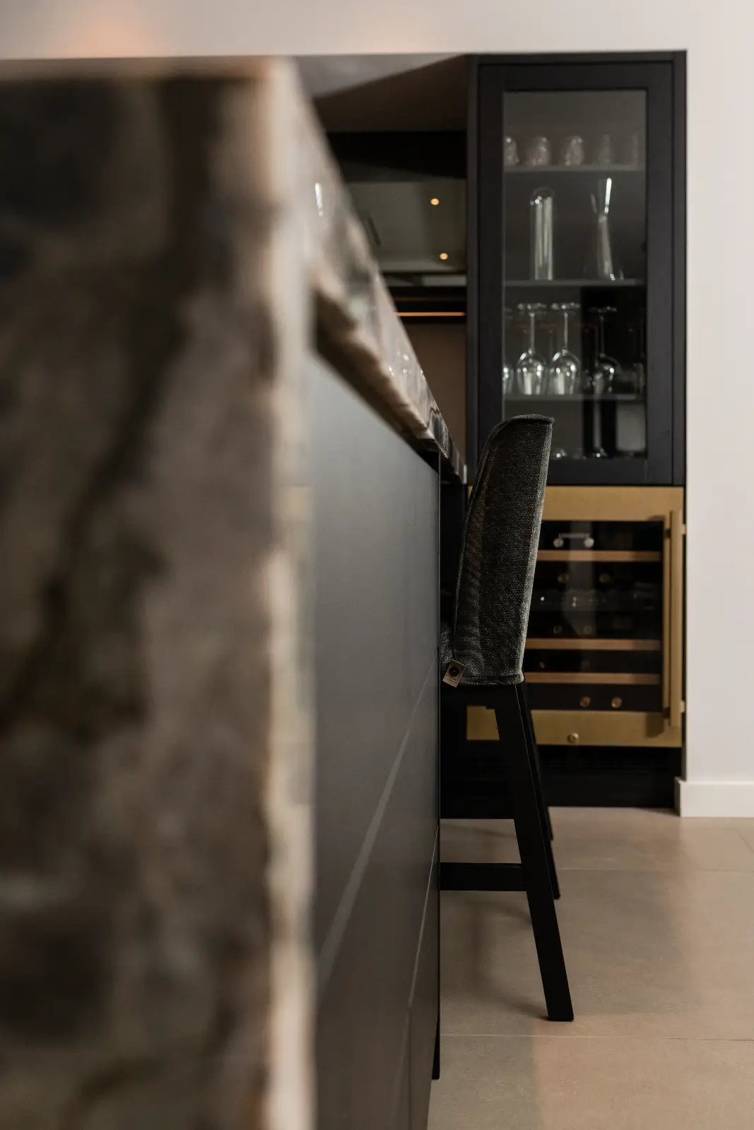 In dit project stond hoogwaardige apparatuur centraal. In de keuken met schier kookeiland moest koken een beleving zijn. Daarom is gekozen voor de nieuwste technologieën van onder andere Gaggenau, Quooker en Liebherr. De keuken is uitgerust met een stoomoven, bakoven, vacumeerlade en een wijnklimaatkast. Alles is uitgevoerd in gespoten messing voor een luxe uitstraling en maximale functionaliteit.