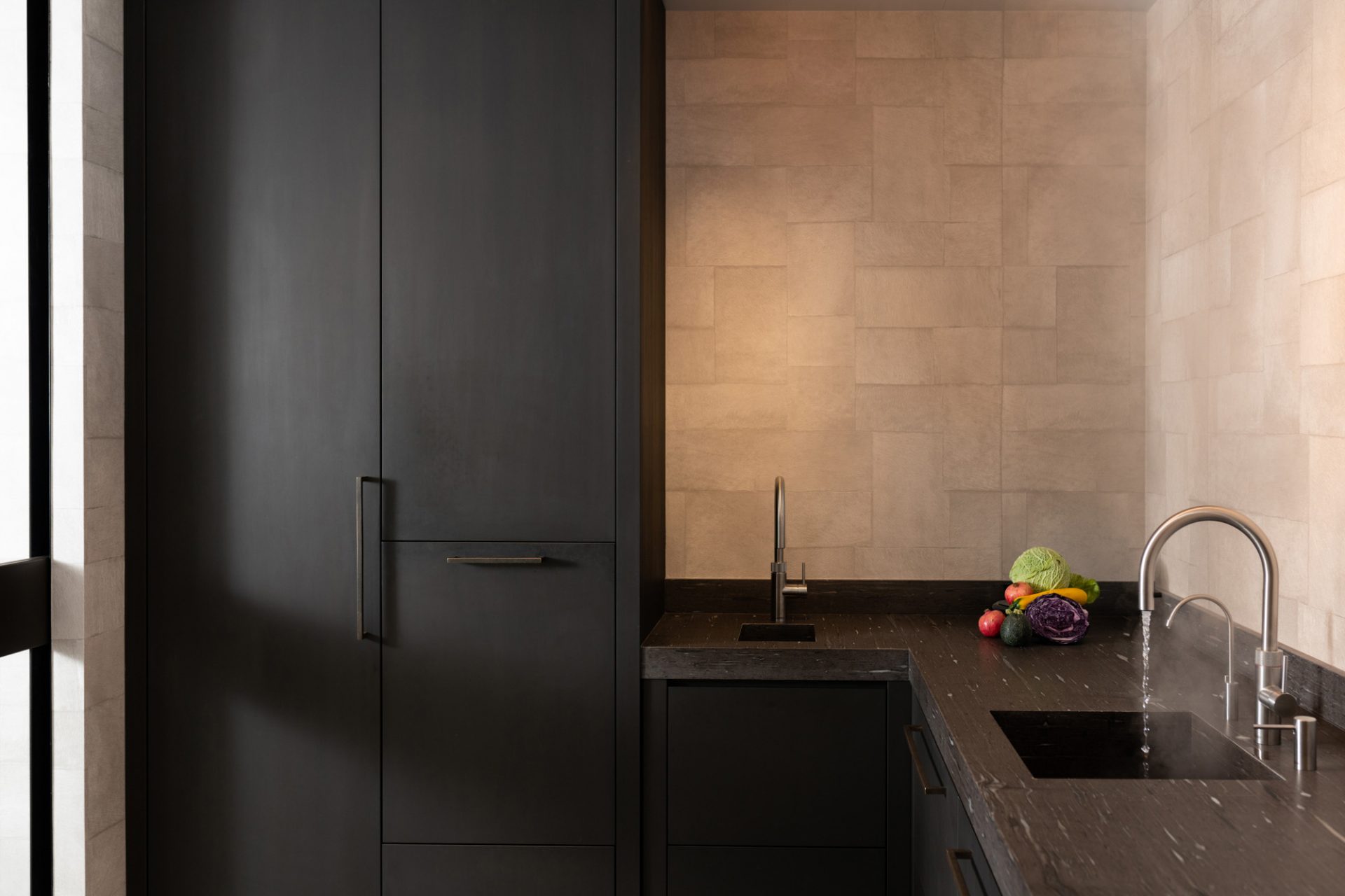 Opvallend in dit ontwerp is de samensmelting die is ontstaan. De deuren van deze donkere keuken zijn voorzien van een bijzondere steelcoating in mangaan met een patina afwerking. Deze kleur loopt door in de keukenfronten.