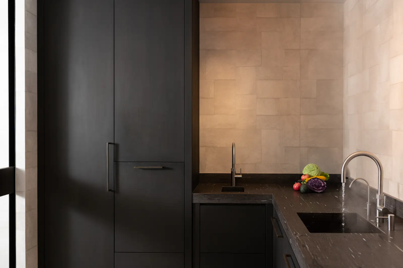 Deze donkere keuken kenmerkt zich door zorgvuldig uitgekozen details die samen een uniek geheel vormen.