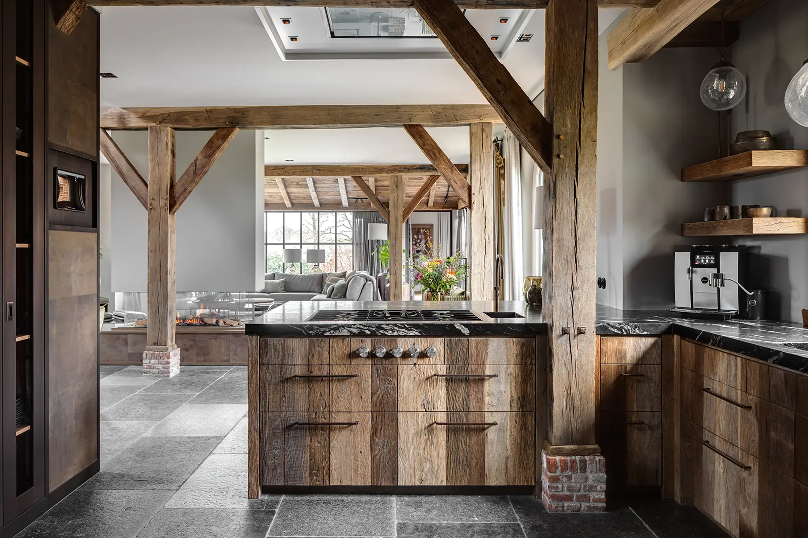 Het granieten keukenblad vormt het absolute middelpunt van deze keuken. In combinatie met de robuuste fronten in oud eikenhout, is deze keuken een uniek plaatje geworden.