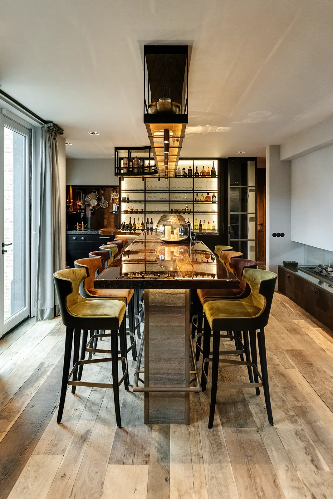 Qua styling is elk detail zorgvuldig uitgewerkt. De verlichting speelt een essentiële rol in het ontwerp en zorgt ervoor dat elk detail perfect tot zijn recht komt. En wat is er fijner dan na een diner met vrienden of familie plaats te nemen bij het sfeervolle kachelelement?